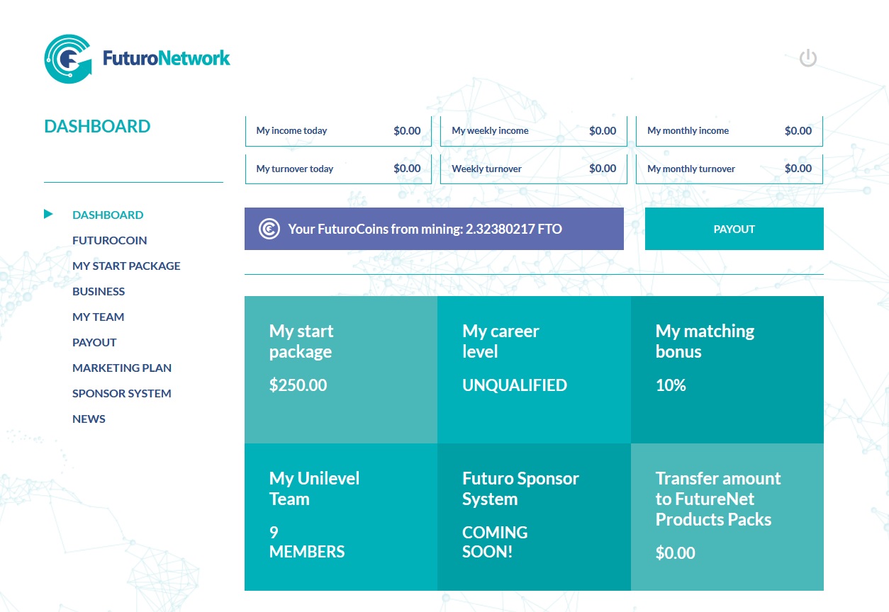 3.11.2018 - Jedna aktuální zpráva ohledně Futuronetwork, kvuli legislativě v EU, USA a Švýcarsku, nemáme v současné době nárok na provize z nákupu balíčků v naší struktuře. Těžba ze zakoupených balíčků a možnost nákupu těžebních balíčků pokračuje nedále bezzezměny. Hodně z nás se tato informace a omezení vůbec nedotkne, ale je dobrá zpráva, že se intenzivně pracuje na řešení..